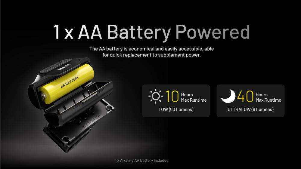 - Napájanie umožňuje široký rozsah napätia a čelovka je kompatibilná s rôznymi batériami typu AA, ako sú alkalické, Ni-MH a lítiové batérie.